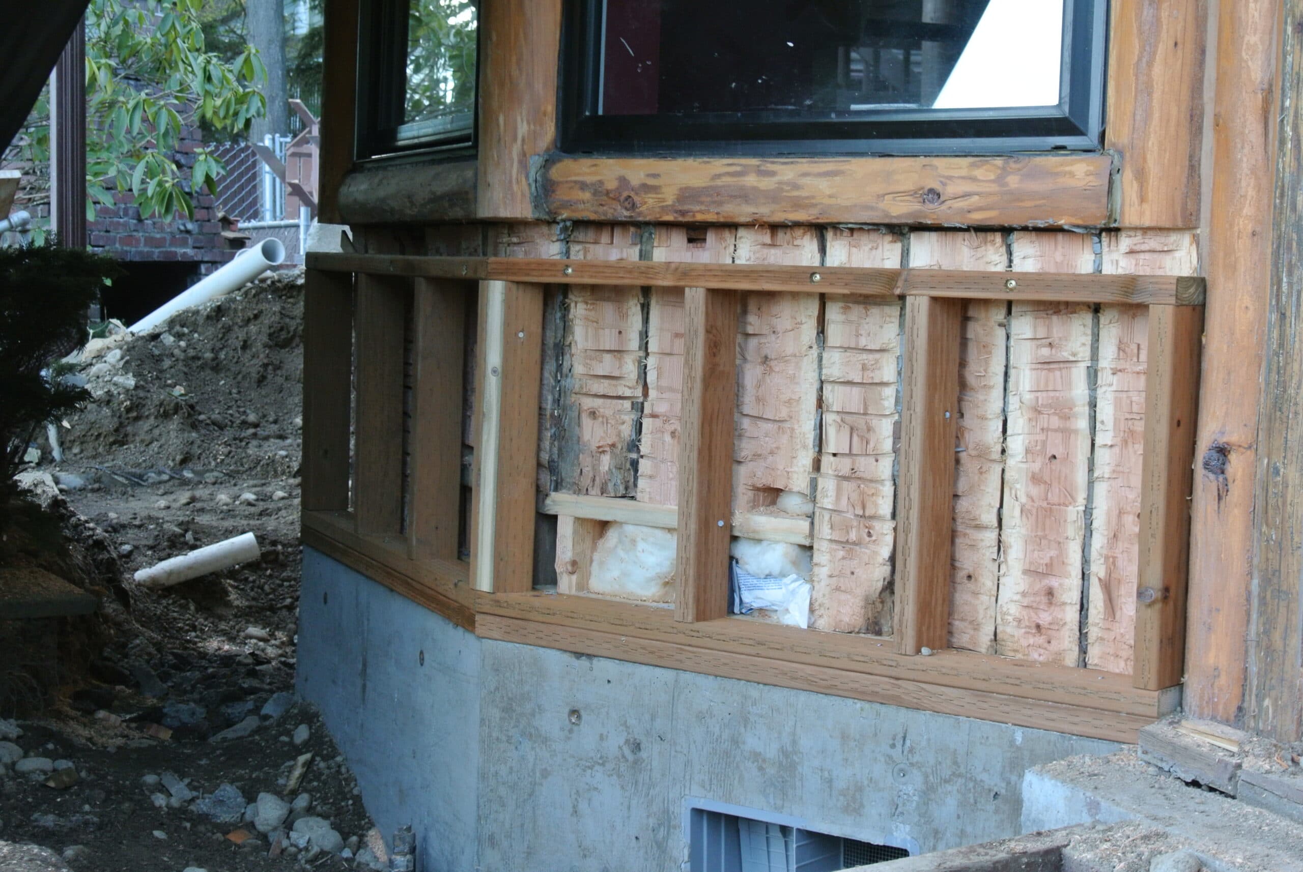 This project we removed half of the log 2-feet from the stem wall. The construction of this home was built with  logs being vertical in stead of horizontal. This caused the water to wick up at the bottom of the log and rot. we removed the rot from the bottom of the log and cut back cut back 3 1/2 inches in to the log. We then framed the area removed and treated the area with a wood preservative. The framed area was insulated and hard-plank installed and rocked.